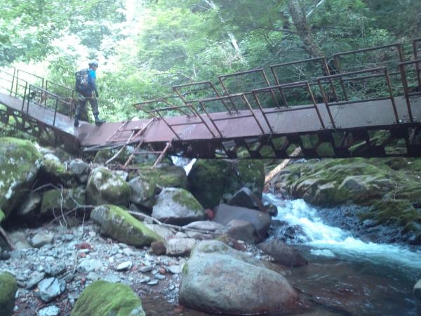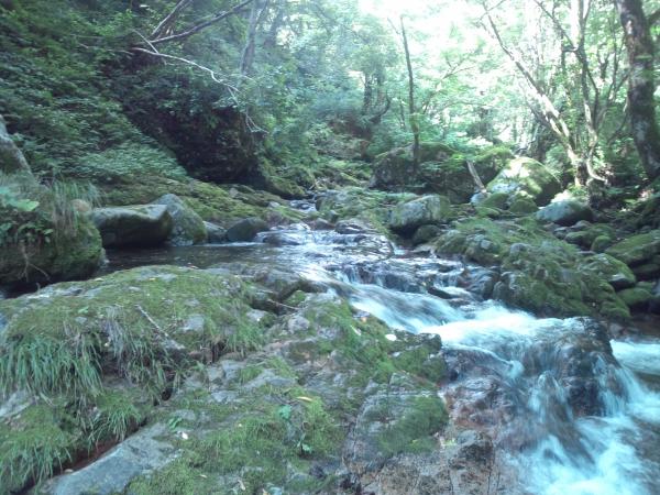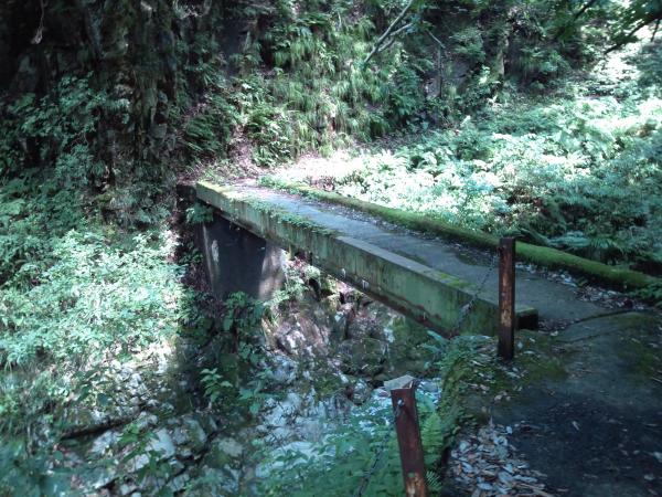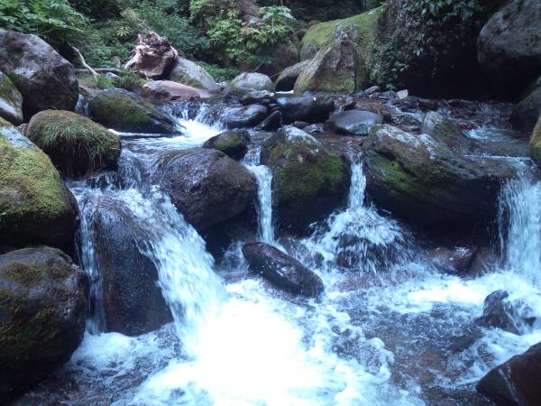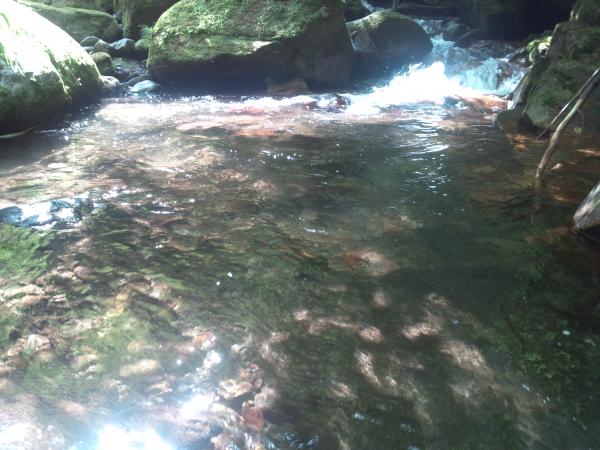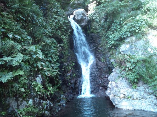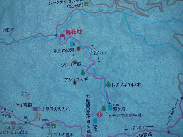 - 遊歩道入口の橋→(5分)→水取入り口(入渓地点)→(20分)→魚止めの滝8m→(160分)→霧ヶ滝二段80m→(15分)→赤滝40m(遡行終了地点)→(70分)→遊歩道入口の橋
