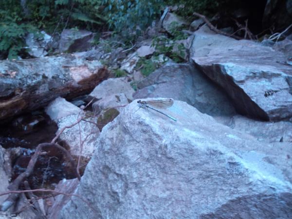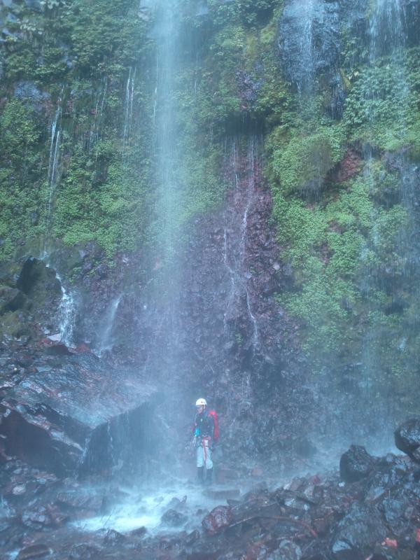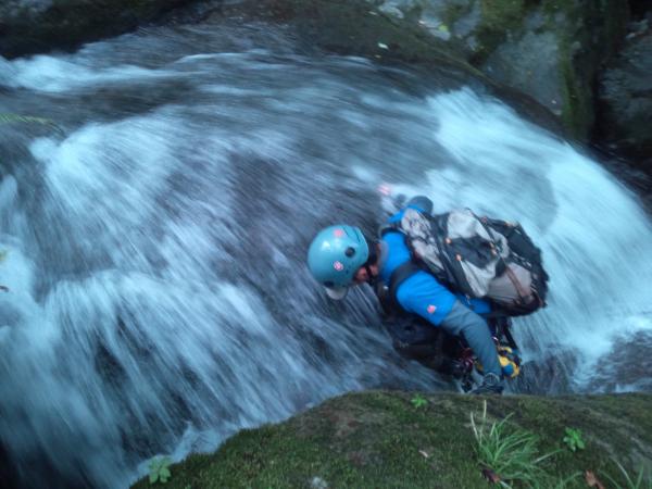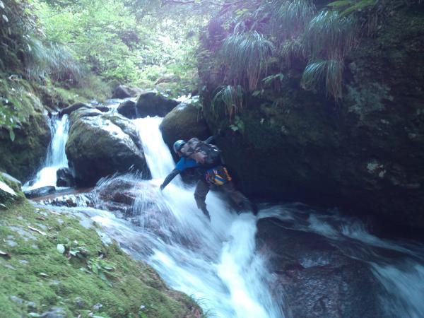 魚止めの滝8mは右岸をまいて滝上部へ懸垂下降しました。