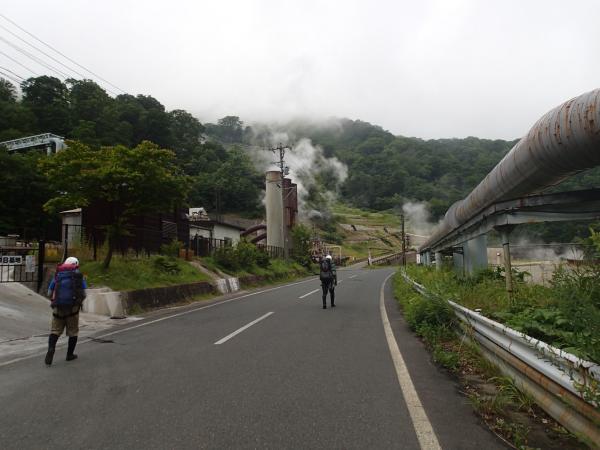 今話題の地熱発電所を抜けて葛根田川へ。上1/3は濃い青空と大きくて白い雲、そして中1/3は優しきブナの濃い緑の葉と白い幹、そして下1/3は深くて冷たそうなエメラルドグリーンの水と太陽の光を反射させ更に明るくきれいに見える白い岩肌・・・まさに夏休み山行にぴったりのロケーション。