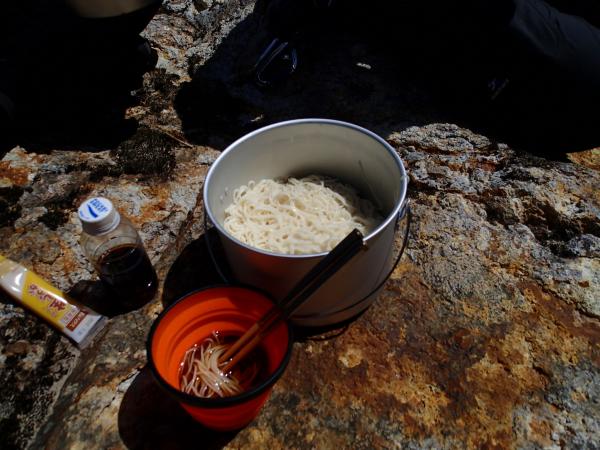 お昼はそうめんをいただき日本の夏を満喫。しばらく登り幕営地を見つけてポットラックを設営。沢の風景ととてもマッチしていて見た目もバッチリ!
