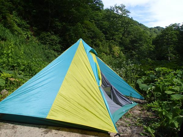 就寝はファイントラックのポットラックで。今回はメッシュインナーも使用。中央に一本のポールだけで支えていて少し心配だったが、周りをペグで止めてテンションをかけるので全く問題なしでした。寝返りを打ってもポールが倒れることはないでしょう。高さがあり通気性も良いのでとても快適に過ごせておススメです!