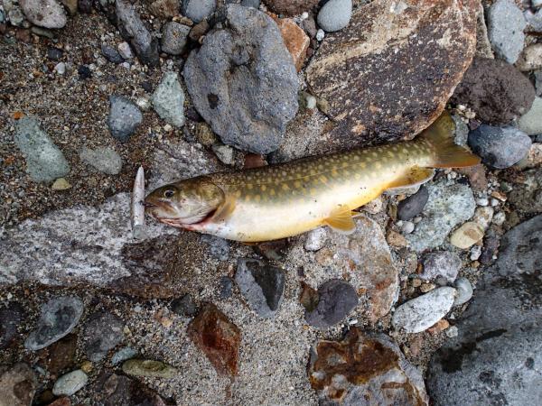 寝床を確保したらいざ釣りへ。私はルアーで挑戦。イワナはもうあちらこちらに見えていて追っかけてくるのになかなか食いついてこず。いろいろ試行錯誤をしながら下手な鉄砲も数打てば当る作戦でなんとか1匹釣り上げることができた。釣りもなかなか奥が深い…