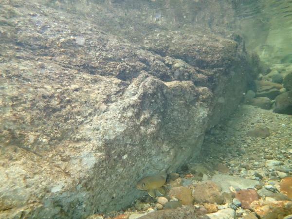 あちらこちらでイワナが悠々と泳いでいる。それを見てか泳ぐ必要性はなかったが、練習にと泳いでみる。テント泊用の80リットルザックが重くなかなか前に進まず、呼吸も何秒と持たず。顔をあげて呼吸しようにもザックの頭がさっぱりした私の頭に当たりなかなか手ごわい。ザックもたっぷり水を吸い上げさらに重くなる。水の冷たさでだんだん体の動きも悪くなる。練習しておいて良かった。
