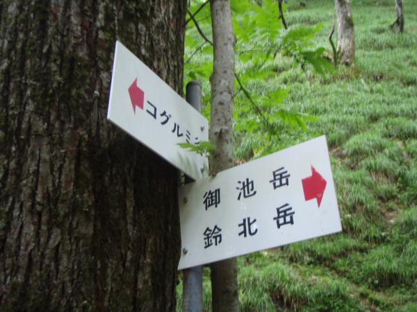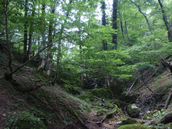 左方の尾根に入りたくなるが、直進が正解。しばらくすると鈴北岳方面のタテ谷分岐が出てきます。
