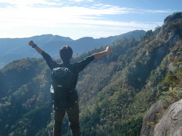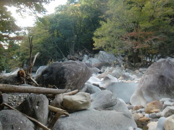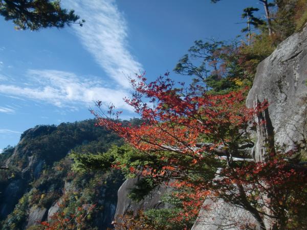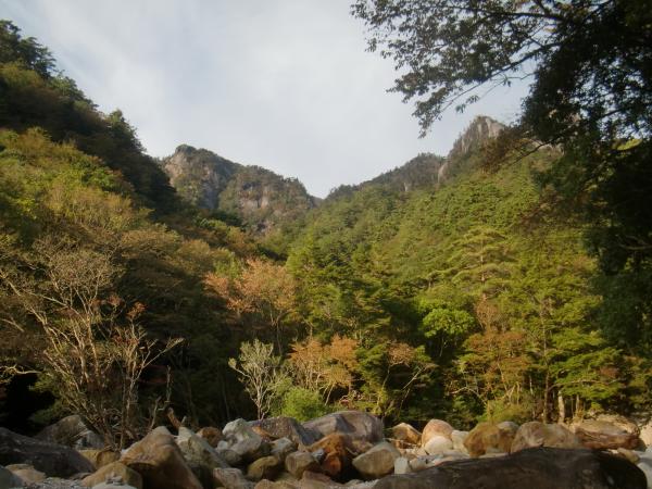 夕方より入山して、大崩山荘に宿泊することにより、翌日の活動時間を長く取れるように計画しました。予想通りコースはハードで時間が足りず、大崩山頂へ行くことは挫折しましたが、コースの途中や小積ダキなどから見える雄大な景色や岩峰に只々圧倒されました。紅葉の見頃はもう少し後のようですが、今現在の部分的紅葉と深い緑の景色もかなりイイですよ。