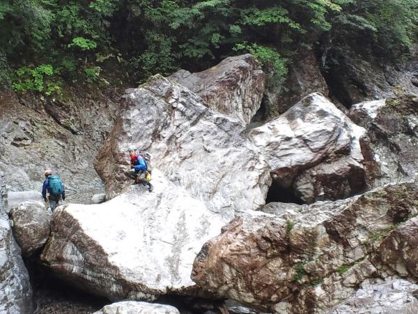 この沢は、前半部と後半部では沢の様子ががらりと変わり、前半部は 明るく開け、巨岩、奇石を
