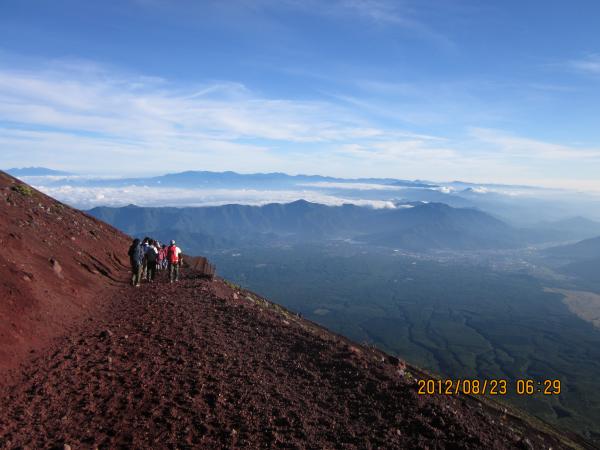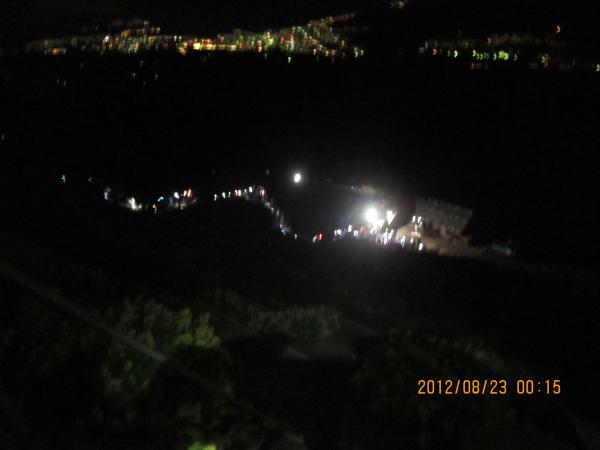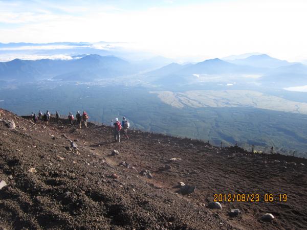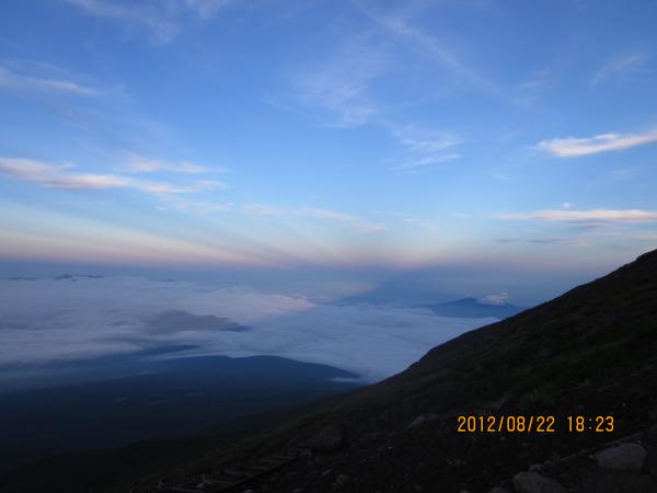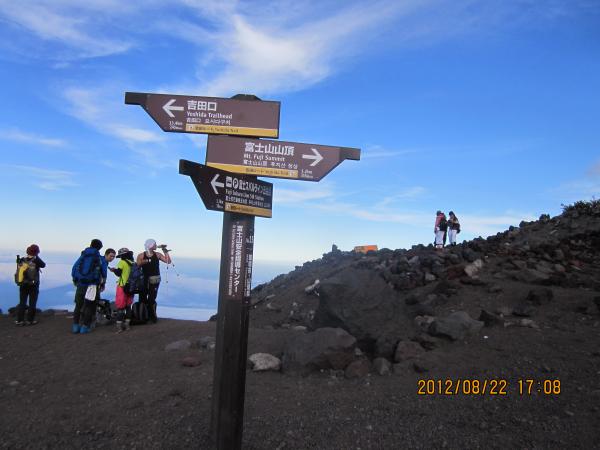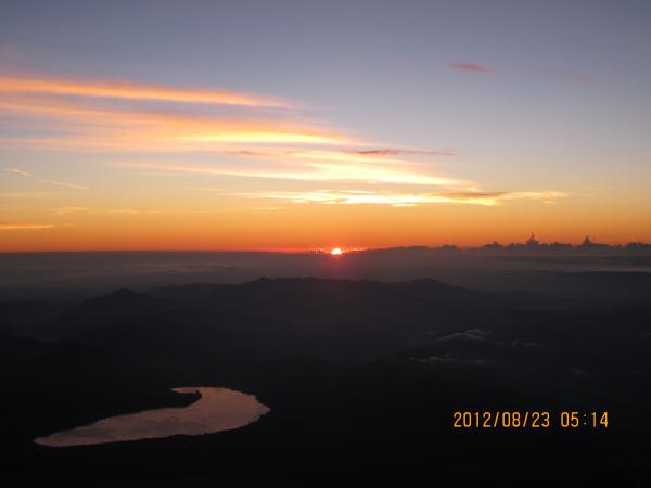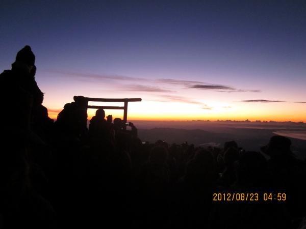 山頂での御来光は8合目より混雑しました。山頂御来光登山は、夜中歩きます、山頂では1時間以上待機する事になります。山頂でエマージェンシーシートにくるまってる方を何名か見ましたので、防寒の用意はしっかり行って下さい。
