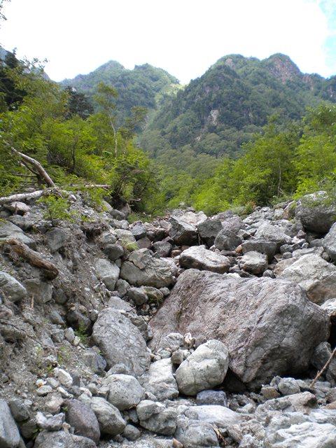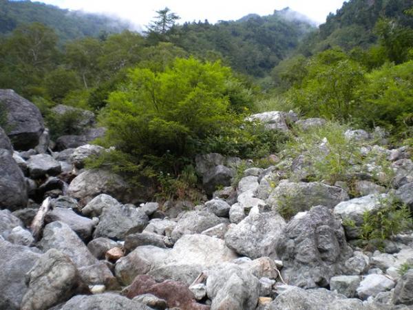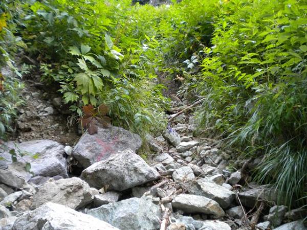 - 水俣乗越から北鎌沢出合までは、明瞭な道がついていますか、急斜面で歩きにくい道です。北鎌沢出合からは、右俣を登っていきますが、大岩がゴロゴロしている急登です。基本、沢の分かれは右をとっていきますが、一箇所左に入るところがあり注意が必要です。最近、大天井ヒュッテの方により☓印がつけられていました。また左俣との分岐が最後の水場となります。
