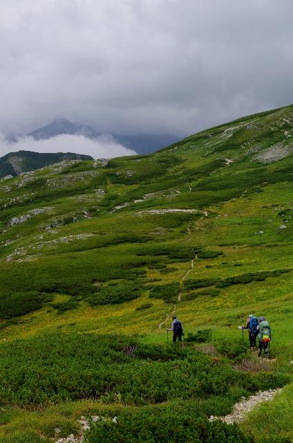 お昼頃から槍ヶ岳の後ろから黒い怪しい雲が湧いてきたので、双六岳稜線は四日目の朝においておいて中道ルートから双六山荘へ。