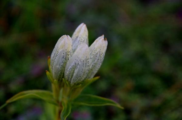 しかし四日目の朝はあいにく濃い霧雨。ライチョウと遭遇するも取れた写真は朝露に濡れたトウヤクリンドウのみ。