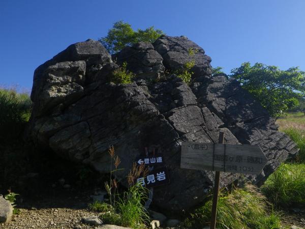 ゆるゆるとススキ原を進んで行くと「月見岩」というおおきな岩が3つあるスポットに出くわしました。