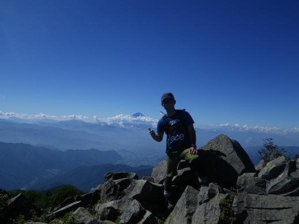乾徳山山頂!遥か遠くに金峰山の山頂の岩が見えます!
