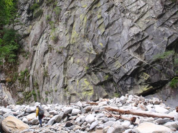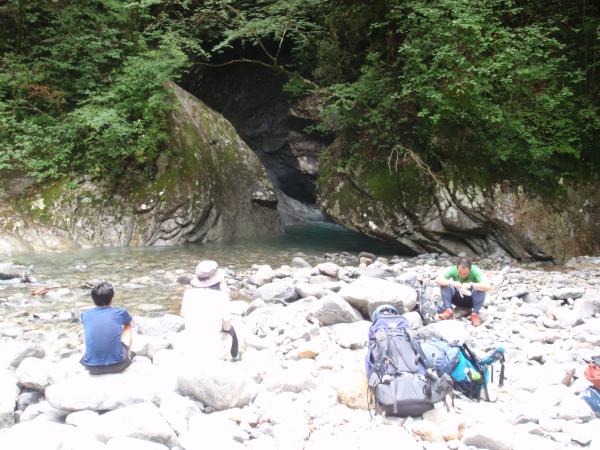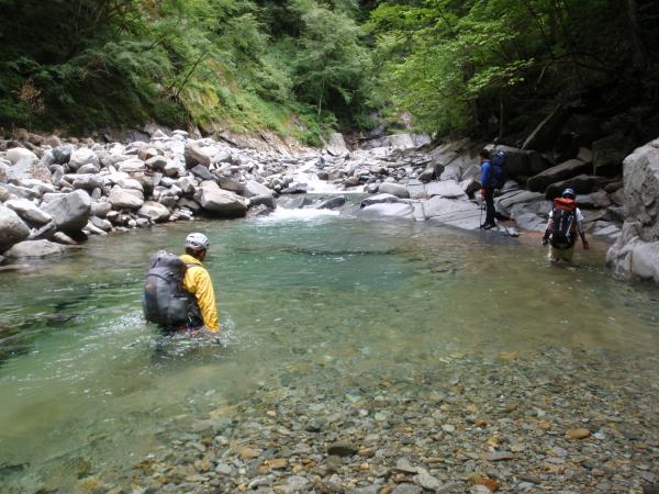 西沢渓谷駐車場10:50⇒二股つり橋11:20⇒鶏冠谷出合11:30⇒ホラ貝のゴルジュ12:05⇒山ノ神12:40(入渓)13:00⇒乙女ノ沢出合13:30⇒西ノナメ沢出合14:10⇒釜ノ沢出合14:40⇒両門の滝15:45⇒広河原ビバーク適地16:30