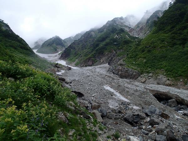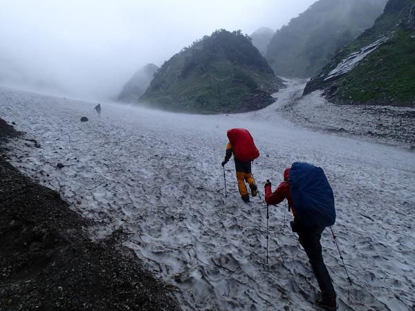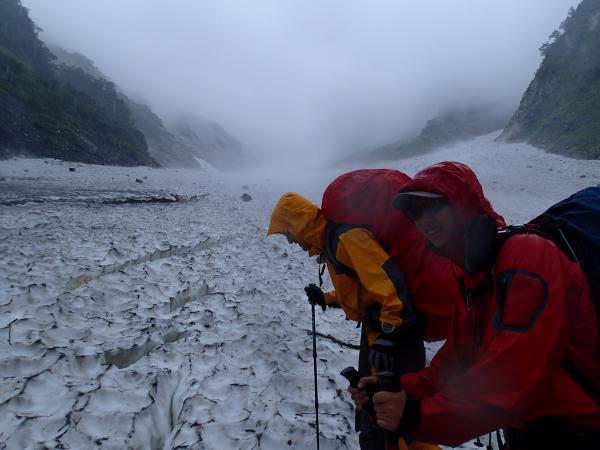 9月でもまだまだあります大雪渓。6本爪の軽アイゼンを使用しました。特に下りで大雪渓を通る方は必携です。落石も多いので上部に注意です。