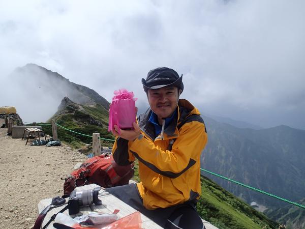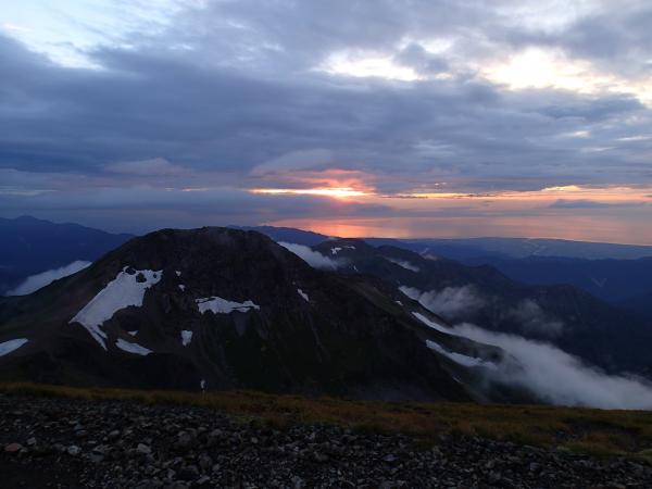 今回は大きな忘れものもなく猿倉を出発し1時間で大雪渓へ。聞いてはいたが見るのは初めて。飯豊山の石転び沢と比較しながら人気では大敗だが斜度とひんやり感は勝ったとか考えているうちに雨が強くなり絶景もそこそこに白馬山荘へ。小屋の自炊室で遅めのランチをいただいているうちにだんだんと良い天気に♪一人白馬岳山頂を目指し日本海に沈む夕日を眺めながら良い感じに浸ってました。