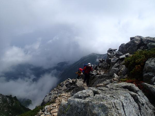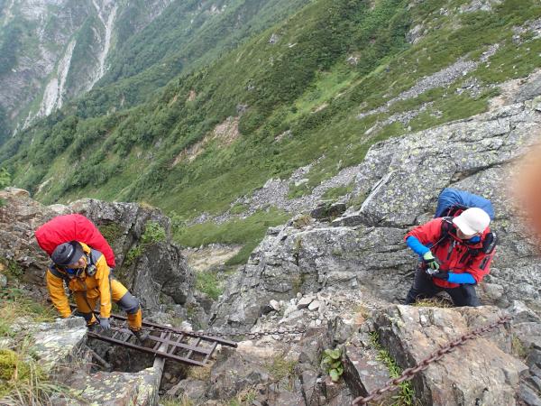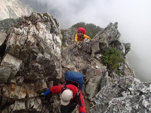 天狗の大下りでは落石注意。不帰嶮は遠目に見るとかなり切り立っていてどこを通るのかも判断できない状態ですが、取り付いてみると鎖もホールドもしっかりしていて迷うところはありませんでした。