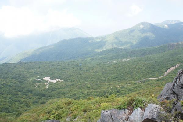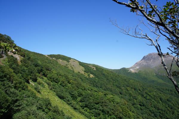 黒尾谷岳(1589m)を後にし稼いだ高度を下げて行きます(100mくらい)南月山へ向かう稜線は東側が崖になっていますので注意して歩いて下さい。