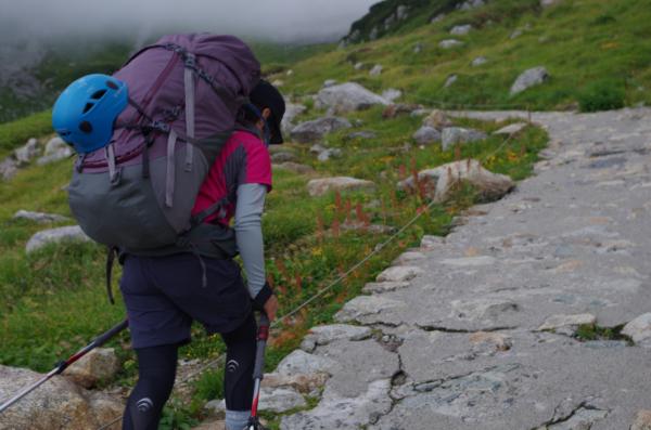 別山分岐から剣沢への下りは岩が多く濡れていると滑る易い。転んで肘を擦りむいている人がいました。