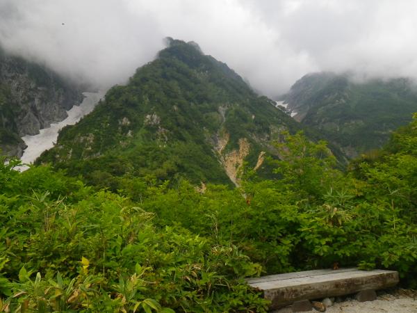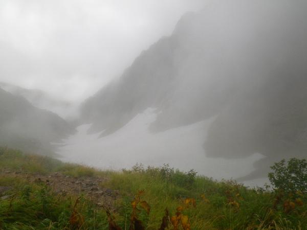 くもりの中、歩き続け、真砂沢ロッジを通過し、剱沢雪渓へ。