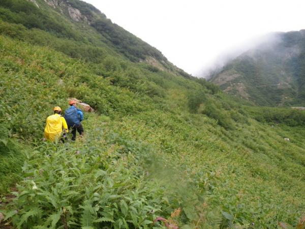 最初はクライミング的な要素が必要な岩場歩き、急な下り、雪渓を歩きます。