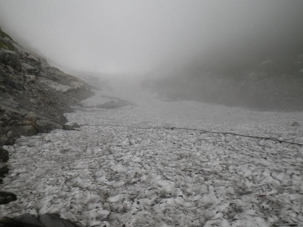 雪渓が崩壊しており、かなり危険な状態に。下ばかり歩くと危ないので、