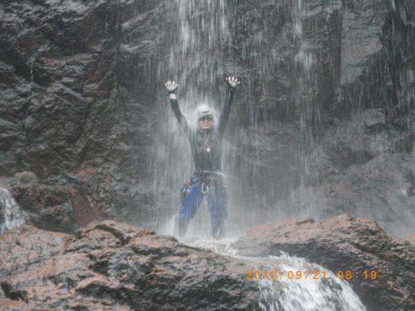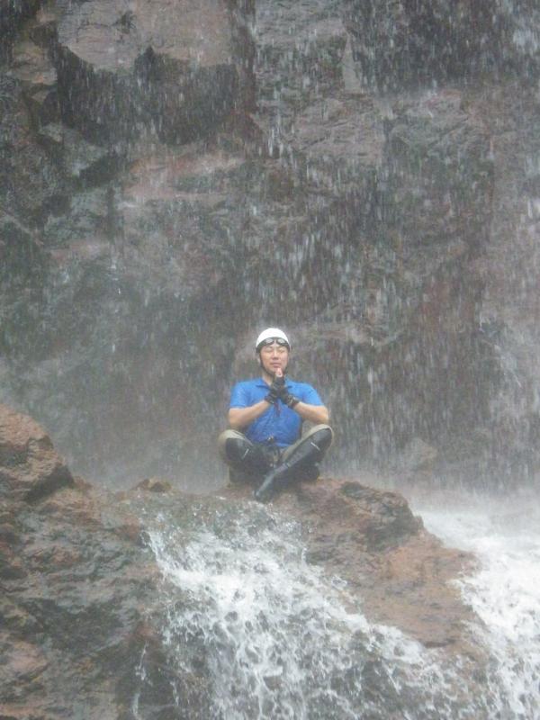 壁の様な滝を登ったり、へつったり、首まで水に浸かったり(泳げない私はロープをくくりつけて引っ張ってもらいましたが…)行けども行けども滝滝滝で、「あといくつの滝を越えればよいのだろう~♪」とオリジナルソングを頭の中で作曲してしまうほど、あきらかに途中からテンションがおかしくなっていました(゜▽、゜)ノ