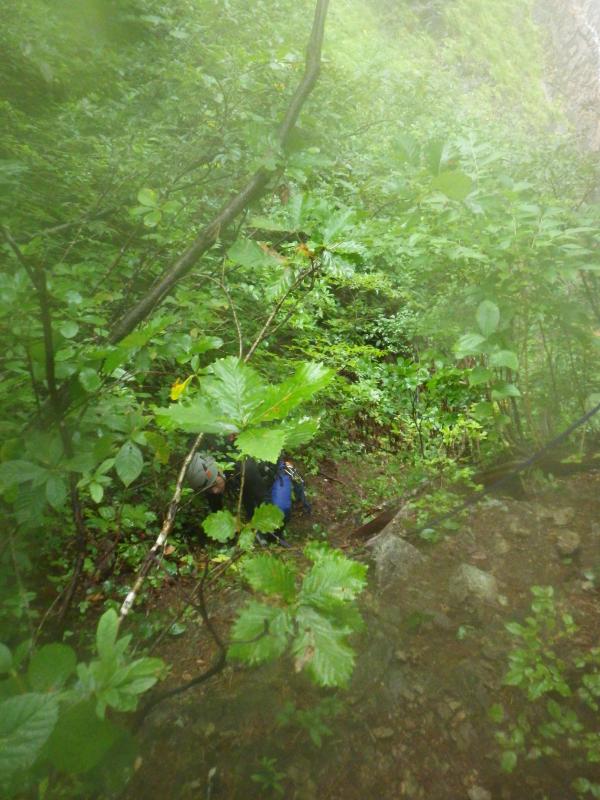そんなわけない・高巻きますとの事でホッと一息ついたのもつかの間、滑りやすい急峻の道を木の根を掴みながら登ったり、滑落したら滝底へダイブの上部をトラバースしたりと、ドキドキひやひやで気分はサバイバル(´Д`;;;)アセアセ