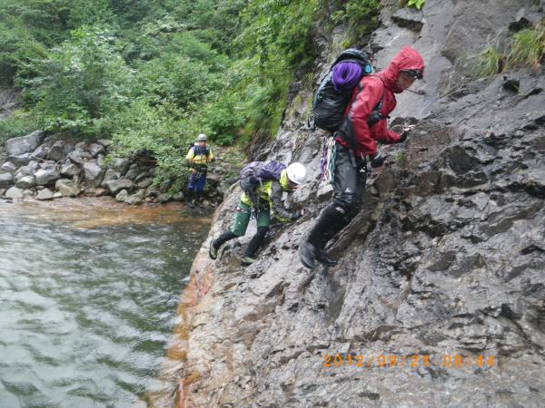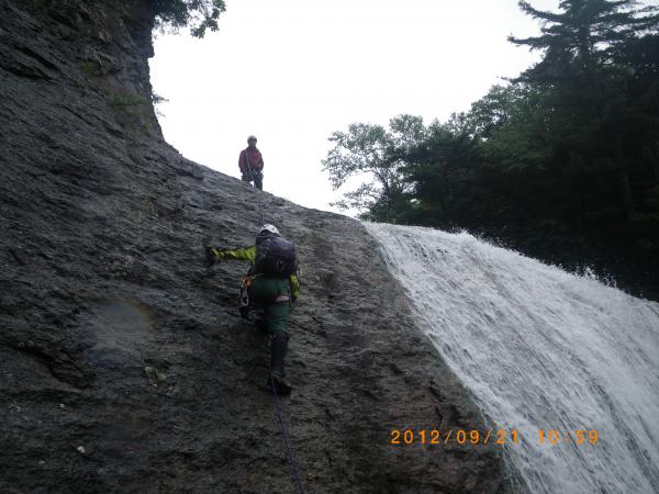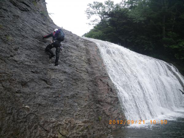 入渓して間もなく15mの滝が現れ、皆小手調べといった感じで登って行きますが、相変わらずチキンな私はヨロヨロしながらなんとか越えて行きます(;´Д`A)