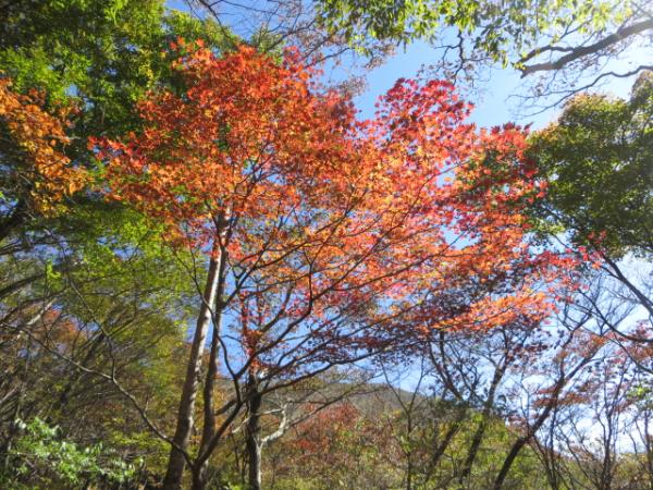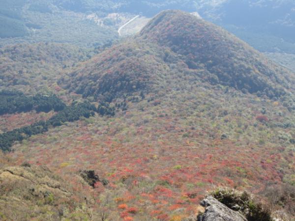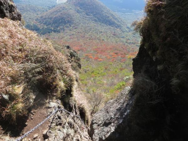 ●由布岳東登山道・・・上部は鎖場が多く、岩場でした。日向岳分岐手前の森の中は踏み跡が不明瞭で、分かりづらいです。テープや黄色のペイントマークを見落とさずに。今回は下りで使いましたが、このルートは上りのほうが快適でしょう。紅葉はこの斜面が一番見頃でした。