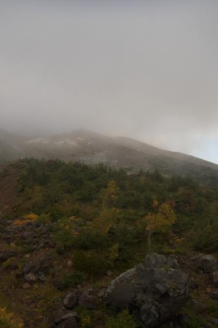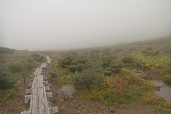 浄土平ビジターセンターのパーキングからすぐに木道があり少し歩くと近くまで車でこれるとは思えないほどの緑豊な自然庭園があらわれ感激しました!木道を酸ヶ原避難小屋まで進むと石の多い登山道になり30分程登ると一切経山山頂に着きました。山頂から五色沼の眺めを期待していましたが残念ながら一面霧が広がり展望は次回のお預けになりました。