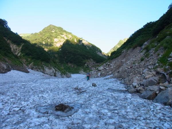 剣山荘にて休憩後真砂沢ロッジへ戻りましたが、嵐のためか途中の雪渓上には落石がゴロゴロ。