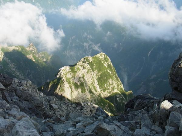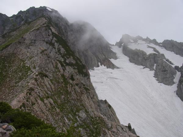 長次郎谷左俣を下降予定でしたが、濃霧でシュルンドも多かったため中止。別山尾根を下降しました。