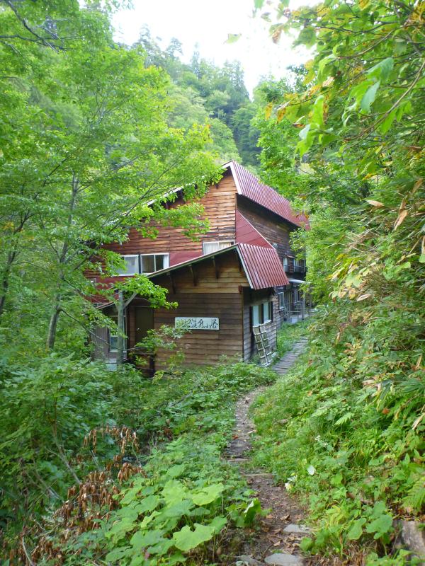 、道は明瞭です。細くて急な坂道を慎重に下ると見えてきました、渋沢温泉小屋。