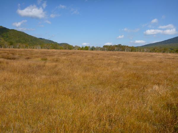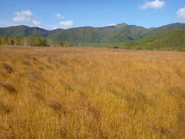 ここの赤田代に着いてようやく尾瀬らしい風景と出会えました。目の前に広がる一面の金色の草原(←のように見える)を眺めていると、まるで太古の時代にいるみたいです。草食の恐竜とかがいそうな(笑)。