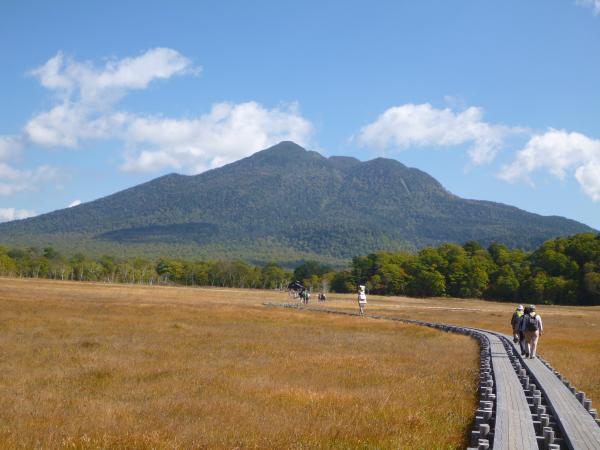 燧ヶ岳、そして木道の両側は金色の草原(←のように見える)。最高にぜいたくな景色です。尾瀬のこの素晴らしい景観がいつまでも残っていてほしい、そう思いました。日本に尾瀬があって良かった(^^)