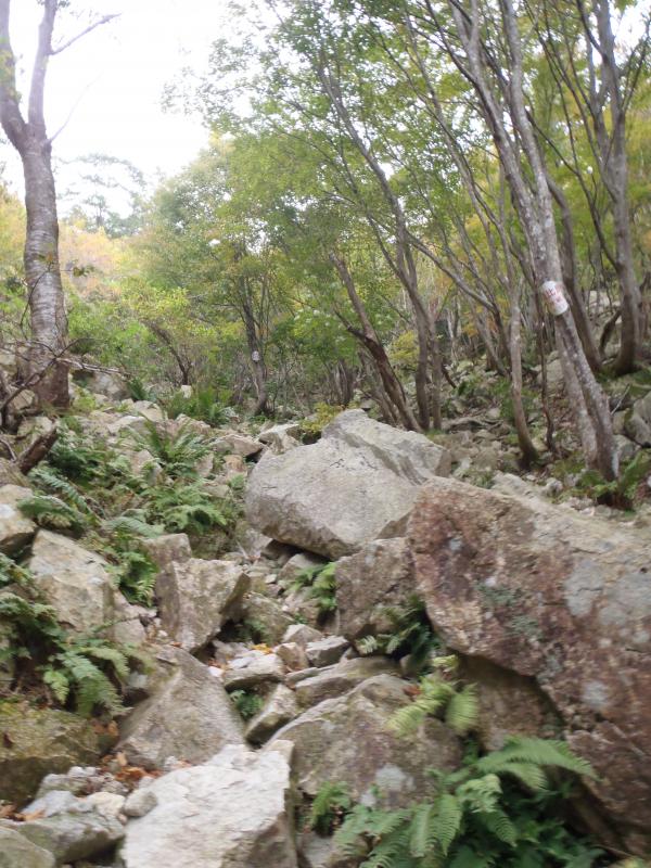 金糞峠から青ガレまではガレ場が続き、足首をひねらないように慎重に下りました。膝が痛くならないように注意して下ることをお勧めします。青ガレを越えてから渡渉が続きます。渡渉箇所を間違えそうになりながら・・・、赤テープの印を見落とさないよう注意しました。