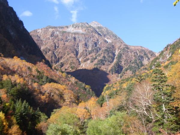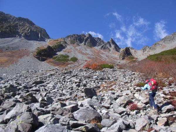 涸沢へ向かう途中は、黄色の葉が美しい紅葉でした。徐々に茶色に変わり、涸沢は、落ち葉となっていました。