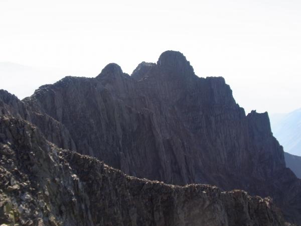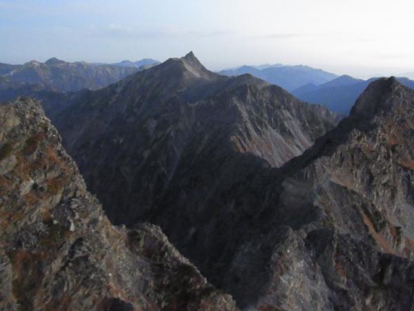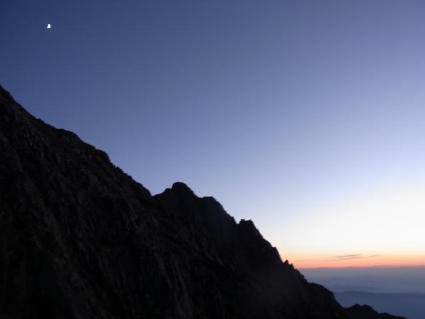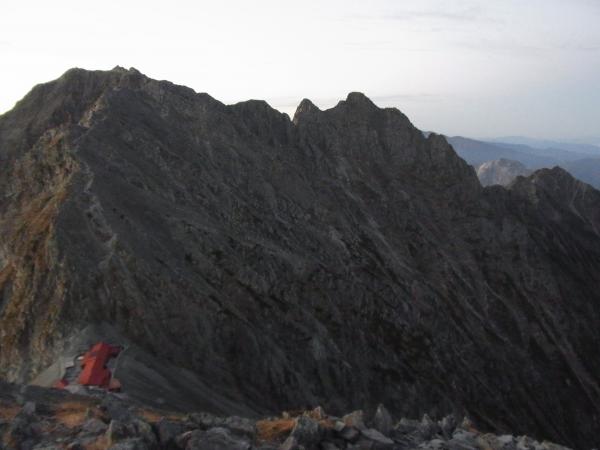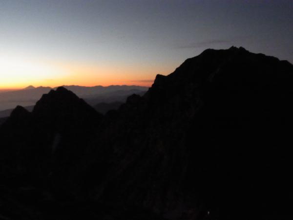 夜明け前に、涸沢岳へ。山頂から周りの山を見ると、薄暗い時の山の岩は、とても迫力があり、圧倒されました。ジャンダルム、奥穂高岳、北穂高岳、槍ヶ岳まで見渡せ、感動の一言です。