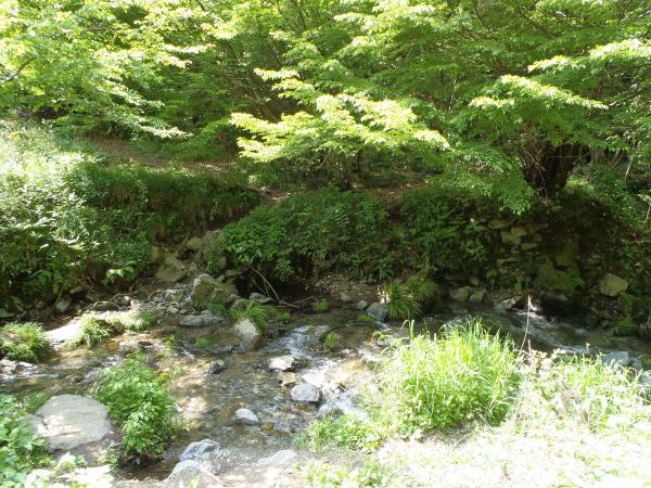 道は思っていたよりは明瞭でした。下りきると沢にぶつかり、ジャンプして飛び越えて林道に合流します。