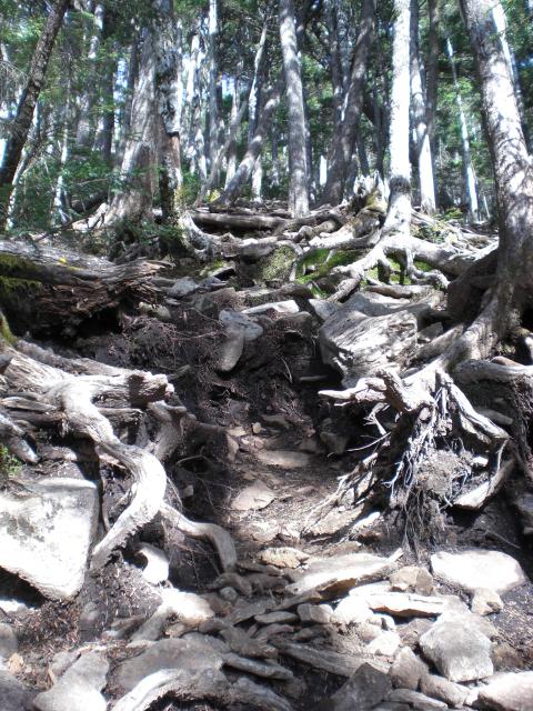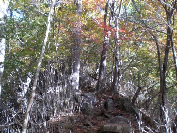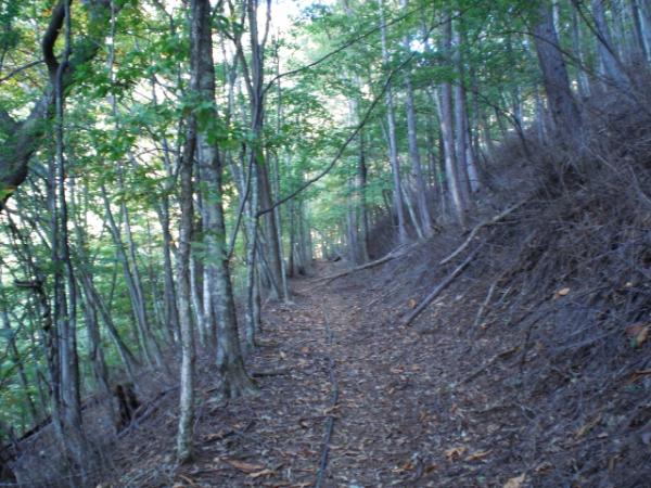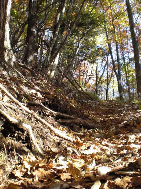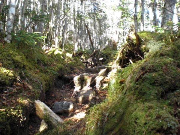 15分ほどの登りの後はしばらく平行移動が続きます。所々に崩落個所があり、ロープが設置されているものの、足場は不安定です。