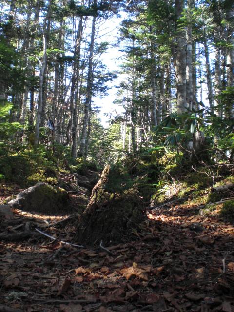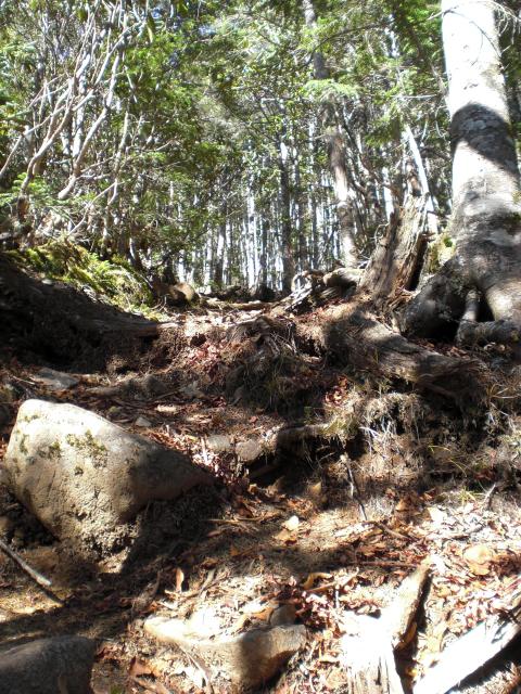 分岐点からも樹林帯の登りが続きますが、近丸新道を利用の場合は「楽」に感じられ、徳ちゃん新道を利用の場合は、入口から木賊山まで同じような登山道の連続に感じられるでしょう。