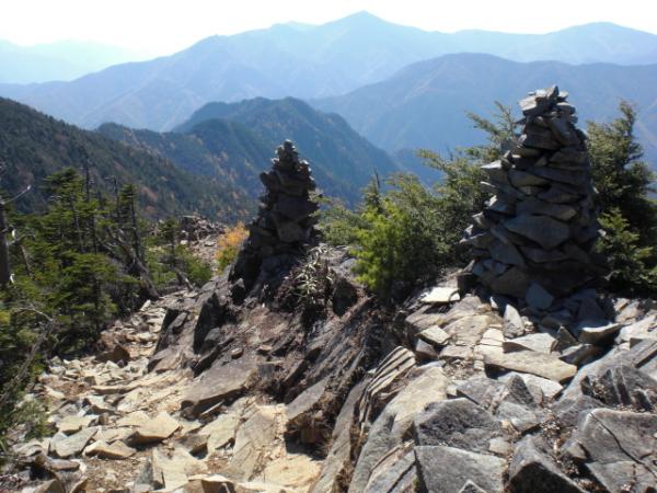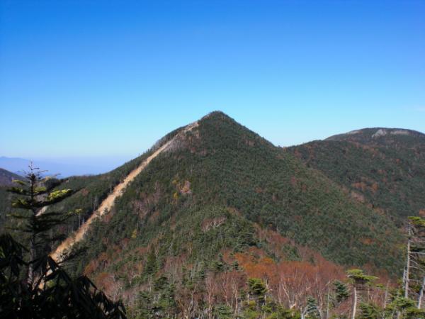 木賊山頂上からは、しばしの下りとなり、5時間の登りからやっと解放されます。甲武信小屋への下りの途中から臨む甲武信ヶ岳は天を突くように雄大ですが、登り返しを想像するとゾッとします。