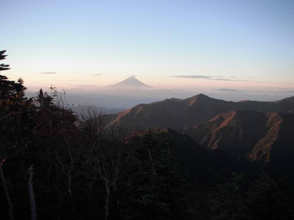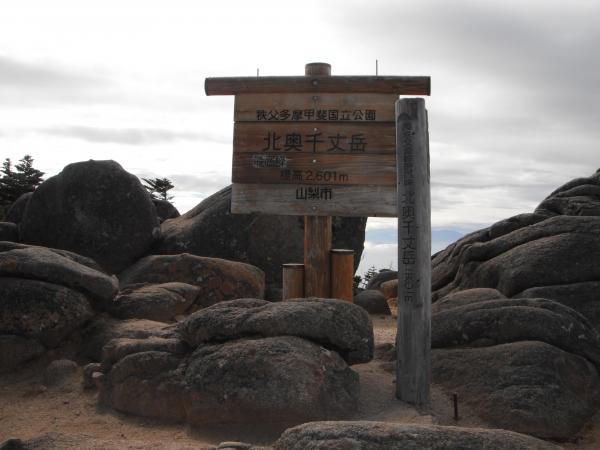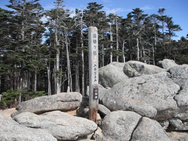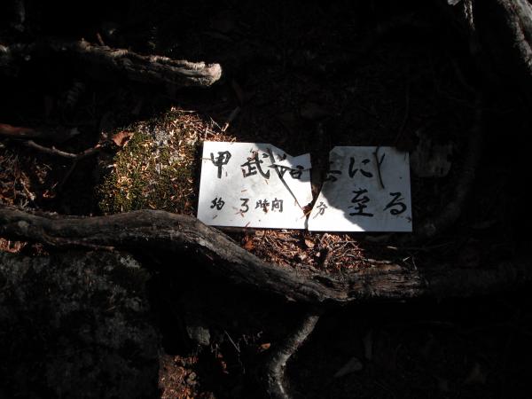 甲武信岳山頂で雲海に浮かぶ富士山に遭遇。今日の行程を無事こなせるよう祈願して出発です。この日は6つの山頂を経て大弛小屋まで行きます。アップダウンを繰り返し、徐々に国司ヶ岳に近づいていく長い登りです。4つ目のピーク、東梓は標識を見落としたらしく、確認できず。無念。