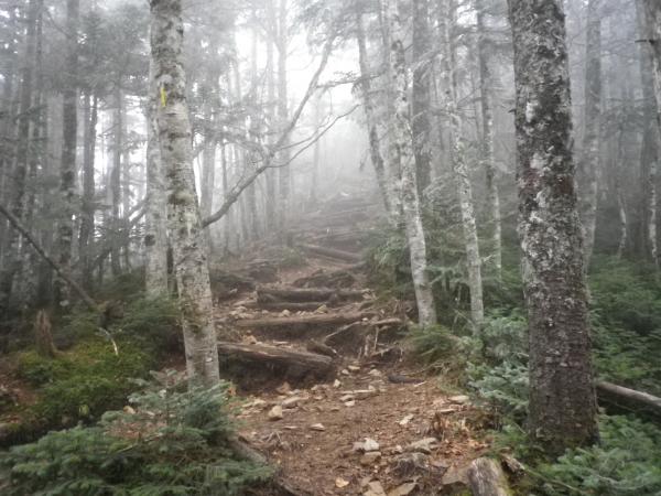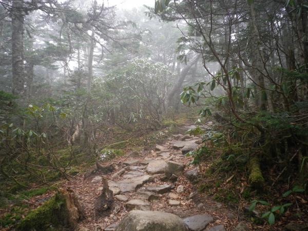 金峰山手前のハイマツ帯と朝日岳前後の岩陵帯以外は、ほとんど針葉樹林の中を歩きます。歩きやすい道ではありますが、コブシ大~一抱えある大きさまでいろいろな岩石があり、浮石もあるので油断は禁物です。