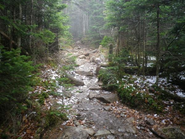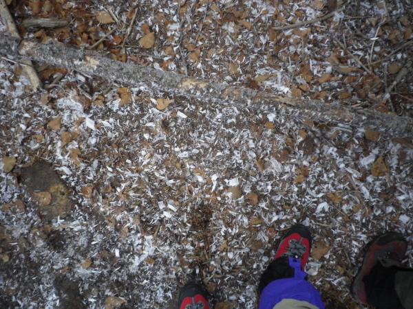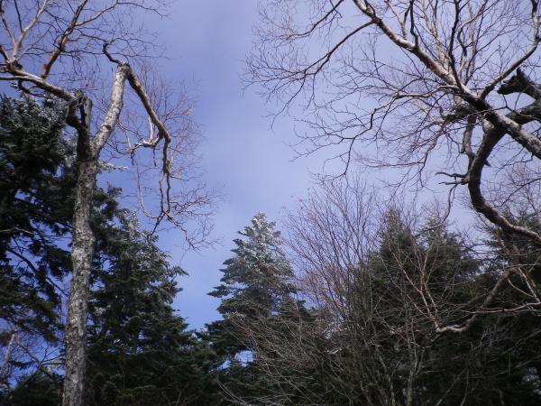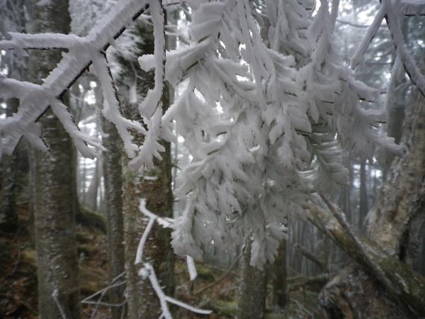 復路後半になると、少し晴れ間が見えてきて、気温も上がったためか、樹氷が溶け落ちてきて登山道に大きな水たまりを作っていたので、歩きにくく、時間をロスしてしまいました。