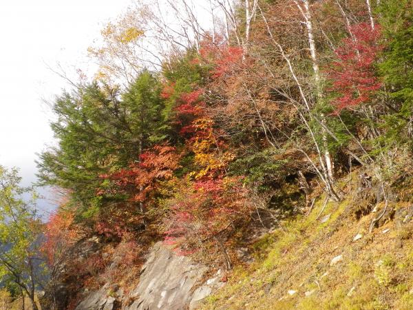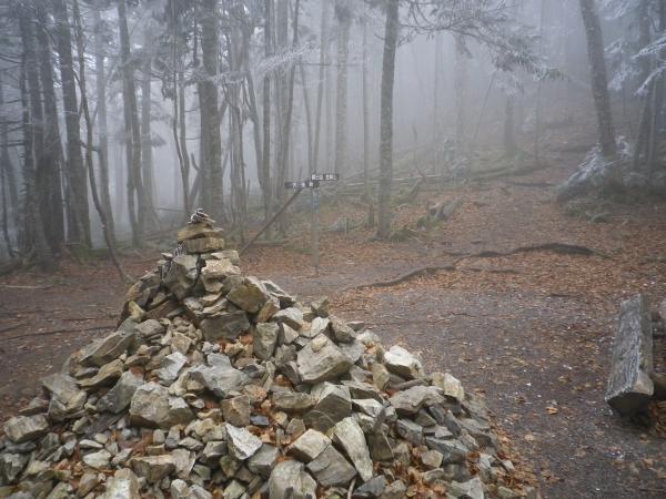 薄手の速乾素材シャツ+厚手のメリノウールアンダーシャツ+薄手ジャケットとそれなりの厚着ですが、風があるので寒いです。さらに防風のためにレインジャケットを着ます。耳が隠れるニットキャップに防寒のグローブもしています。帰りの樹林帯の下りでちょっと暑さを感じたものの、終始この服装でした。
