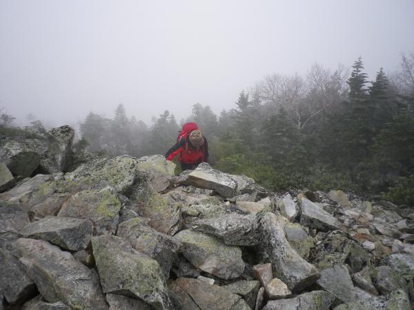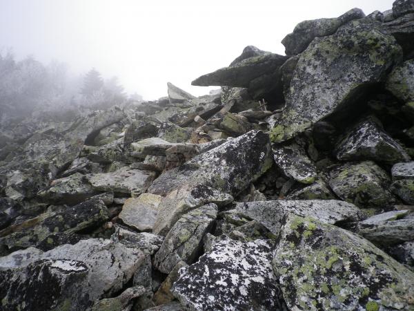 ただし朝日岳前後と山頂直下には傾斜は緩やかですが岩場がありますので、慎重に歩きましょう。岩場のペンキマークは薄く不明瞭になっているところも多く、しっかり確認しながら歩かないと、不必要に困難なルートを歩かなければいけなくなります。