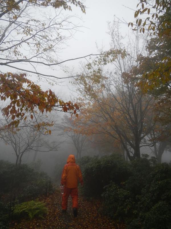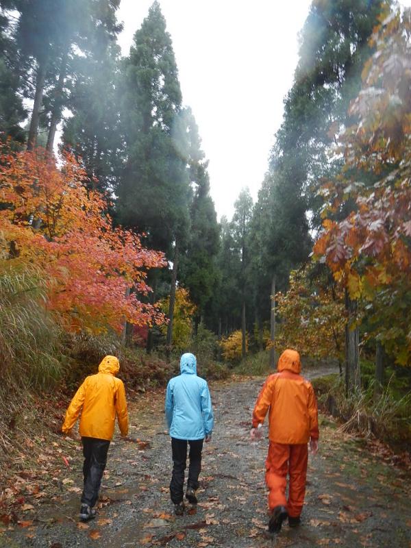 雨のため木の根や木の階段が非常に滑りやすくなっています。