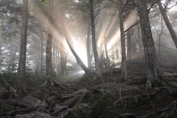 金峰山へ登りは、しばらく苔むした印象的な樹林帯を歩きます。大日小屋から先は少し急な登り道へと変化していき、大日岩を経てやがて稜線歩きへと変化しました。