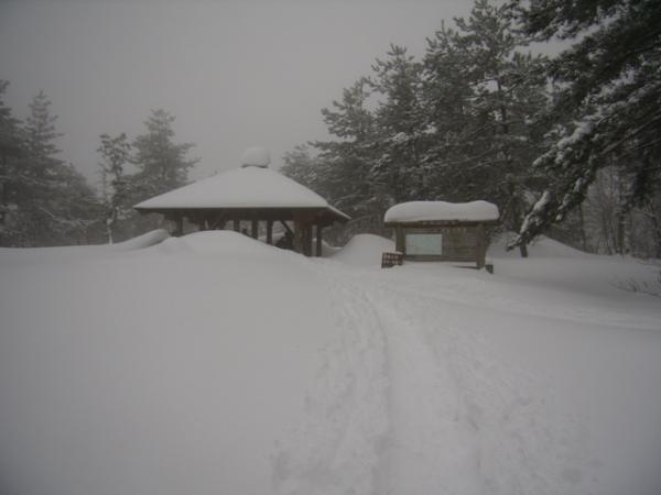 - スキー場(9:35)東屋(10:35)堰堤(10:55)栗柄越(12:10)頂上(12:20)